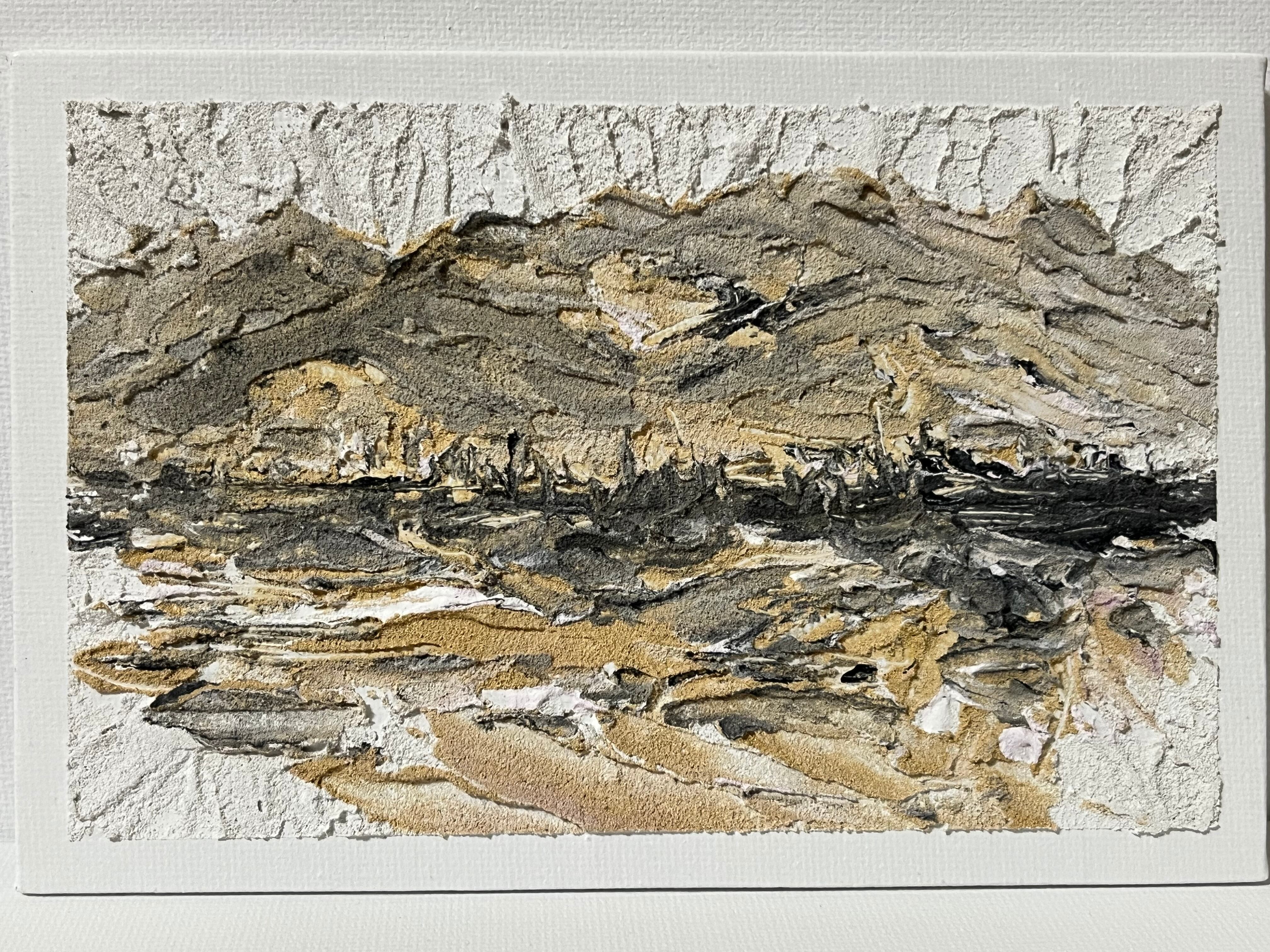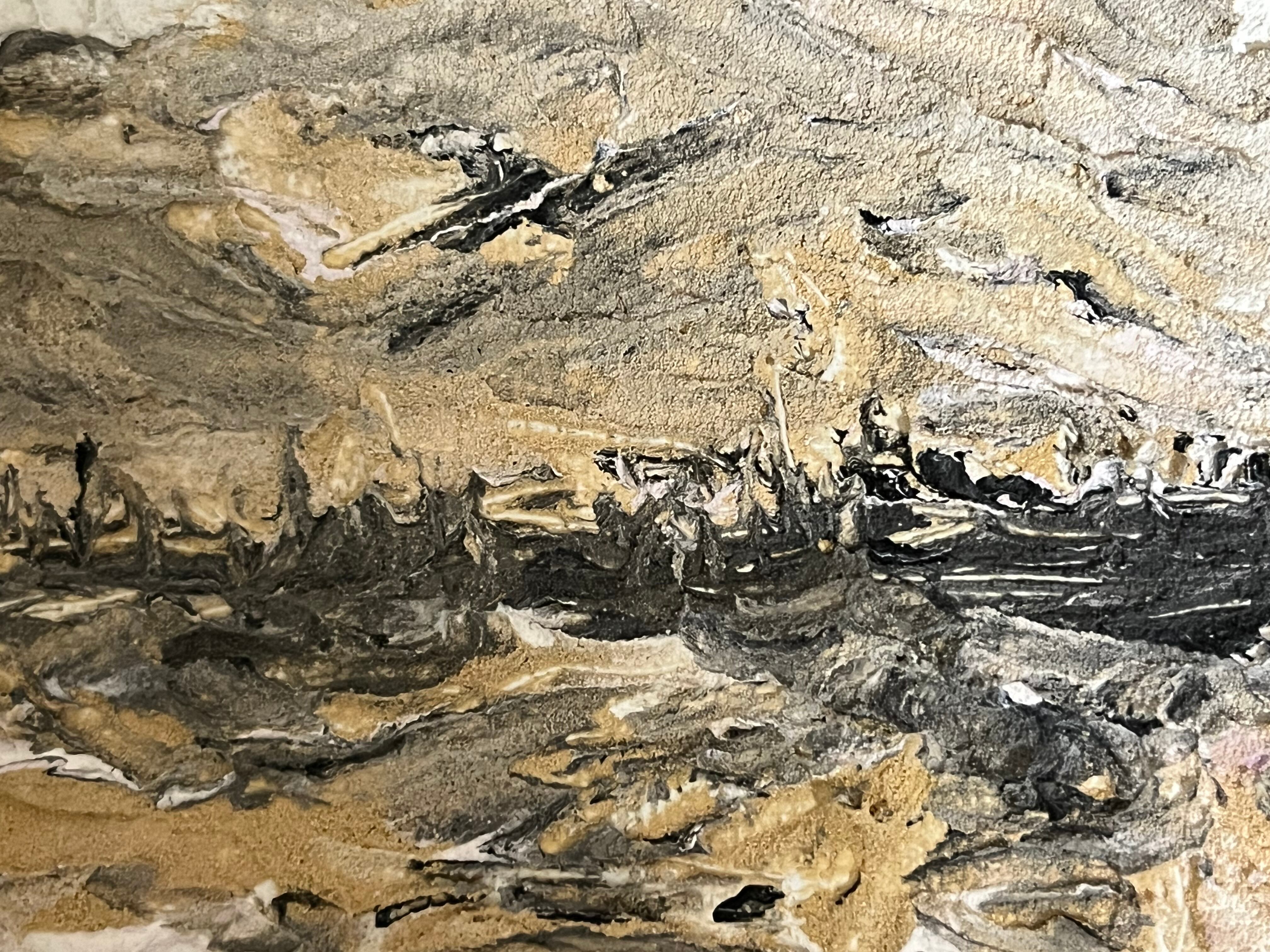 灰色の峰々が金色の霧に溶けゆく、静謐なる山脈の記憶。テクスチャの層が語る大地の息吹は、時の流れに抗う不変の詩情を湛え、魂の安らぎを誘います。心の中に秘めた思いや、大切な瞬間を再認識させる存在となり、特別な空間を演出する一枚となることでしょう。