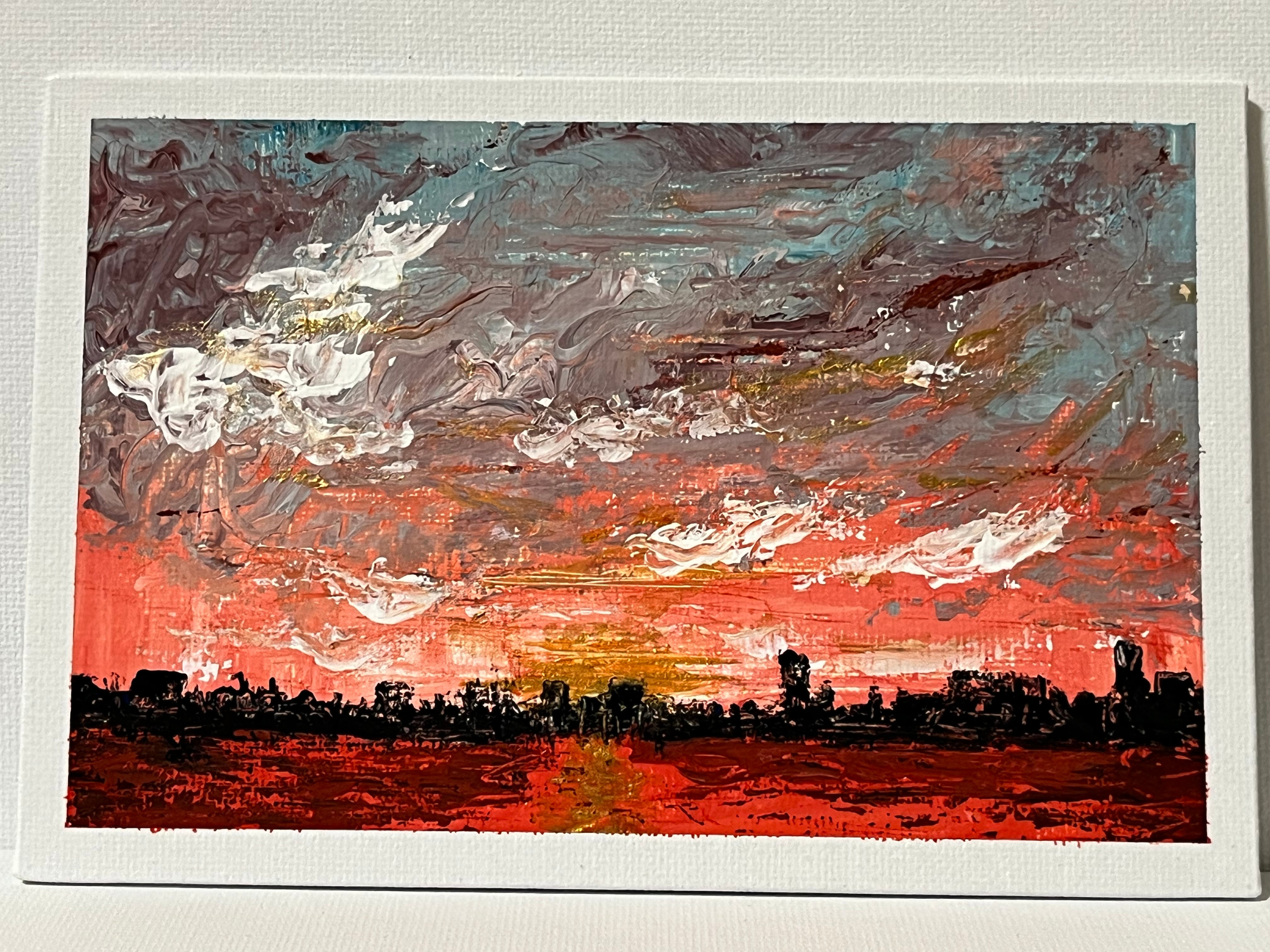 艶やかな夕焼けの空が織り成す、心を癒す美しい作品です。温かみのある色彩が広がり、まるで穏やかな夕暮れ時のひとときを過ごしているかのような感覚が広がります。日常の慌ただしさを忘れ、心に安らぎをもたらす瞬間へと導いてくれることでしょう。何度も鑑賞することで、心の奥に秘めた思い出や感動を呼び覚ます存在となり、特別な空間を演出します。