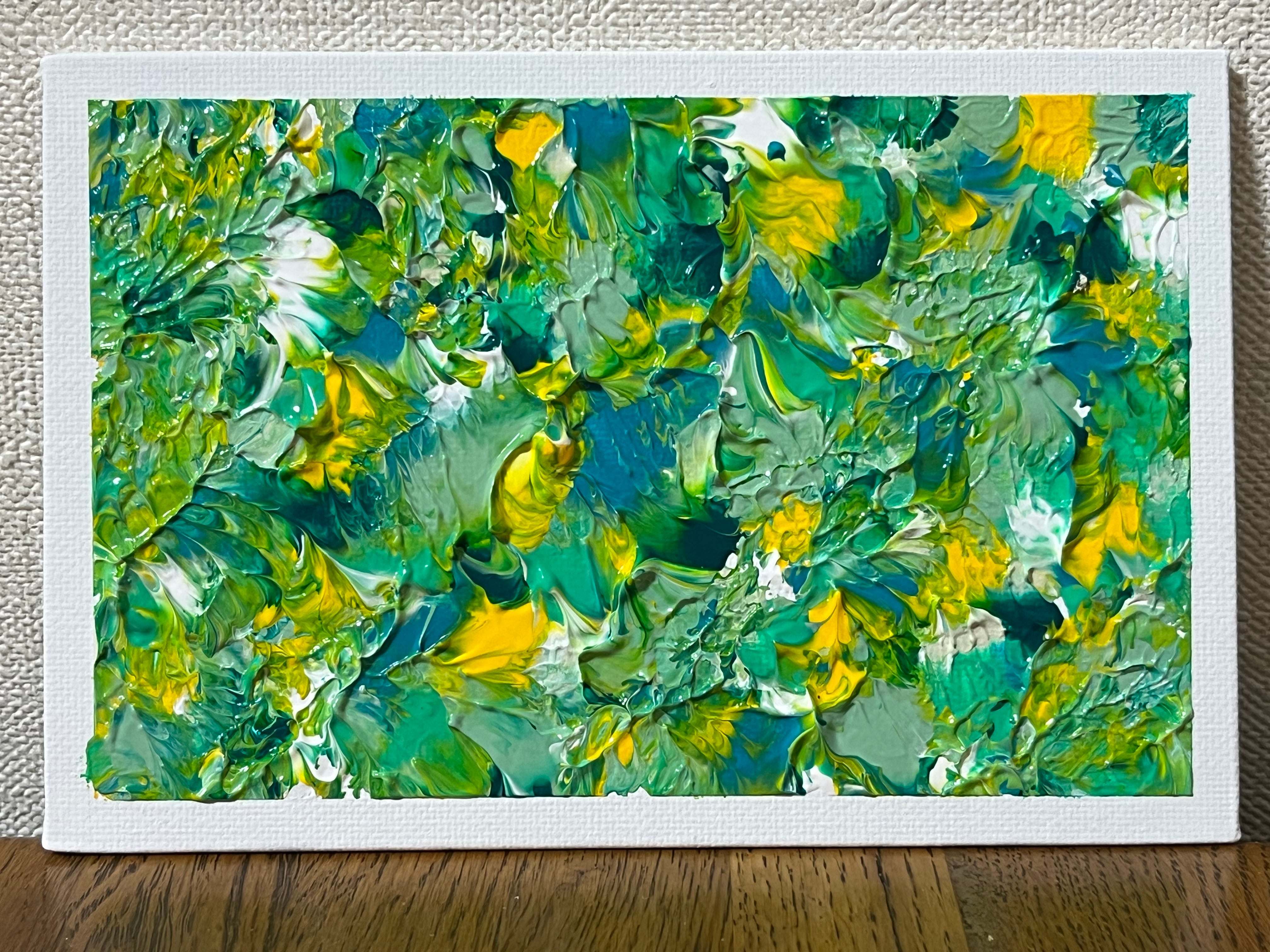 心の奥深くに潜む幻想的な草原を感じさせる、穏やかな緑とふんわりとした花々が描かれ、まるで秘密の草原の中にいるかのような心地よさが広がります。柔らかなトーンが日常の喧騒を忘れさせ、安らぎを与えてくれる一枚です。一度目にしたら、その美しさに魅了され、思わず何度も振り返ってしまうことでしょう。