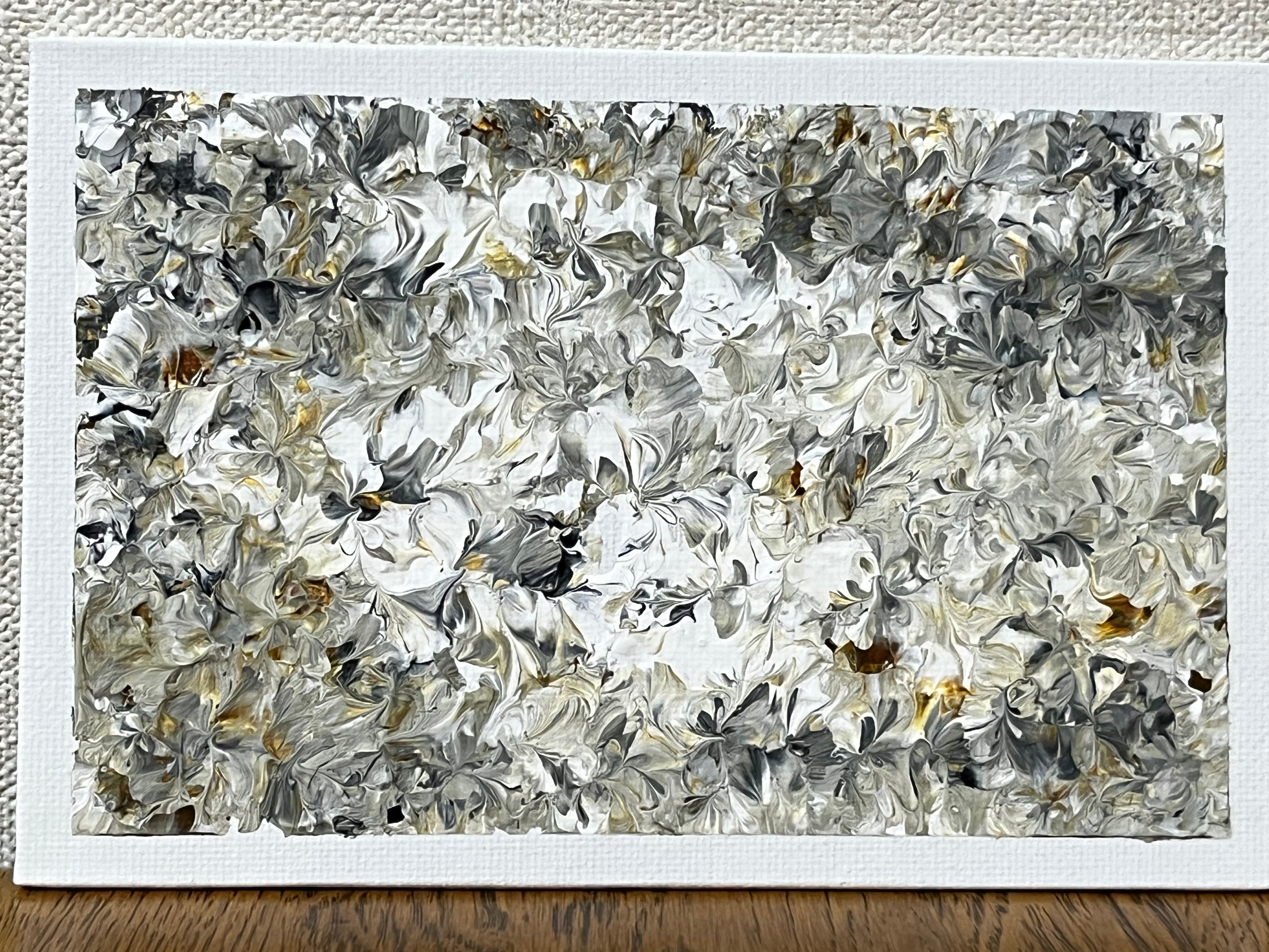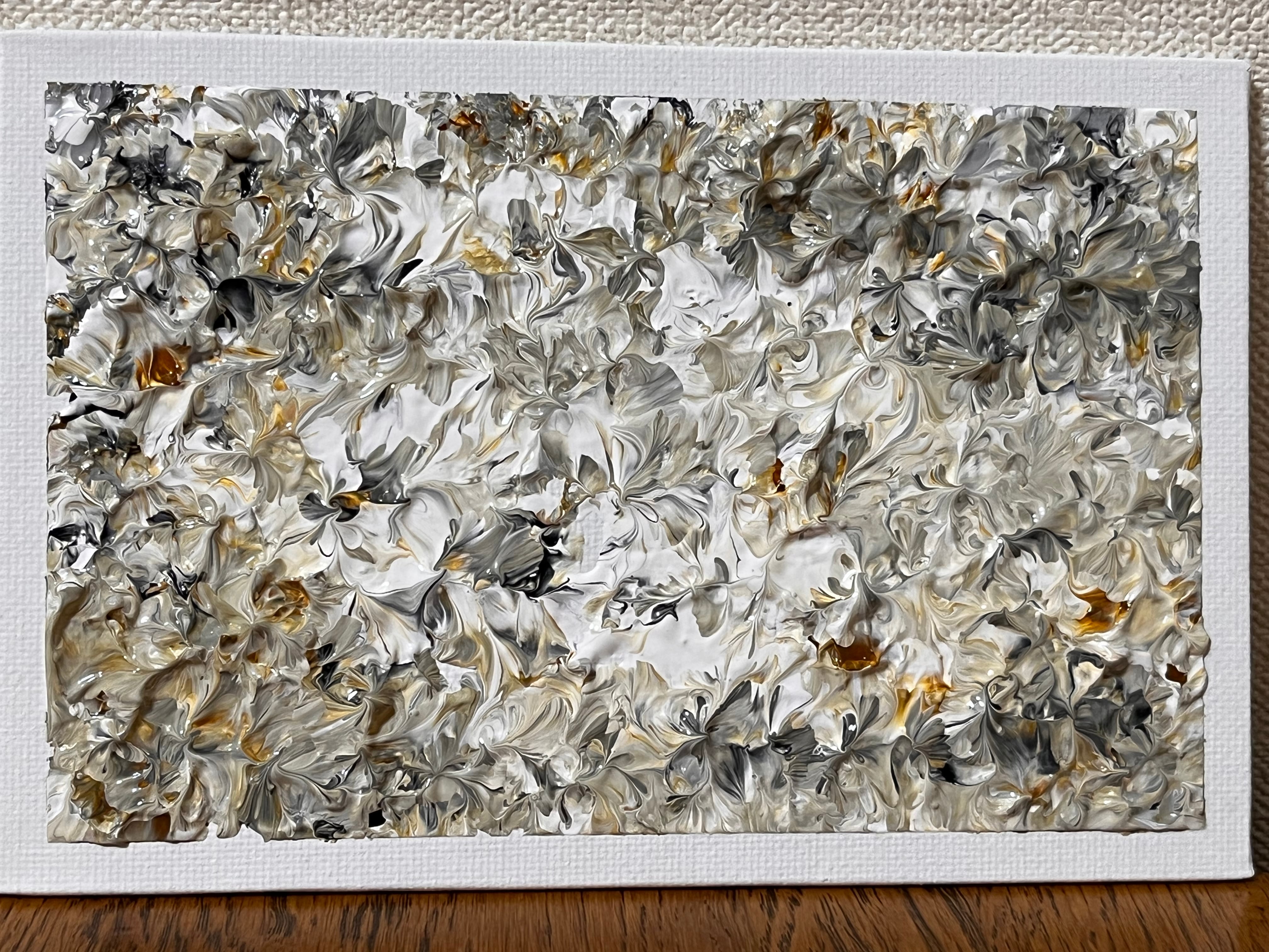 白とシルバーブラックを基調に、ダークブラウンとグレーが繊細に混ざったマーブル模様が、白猫の柔らかな毛並みと月の光を思わせます。厚塗りのテクスチャーが光を反射し、まるで生きているかのように輝きます。清らかで優雅な癒しの空間をお届けします。