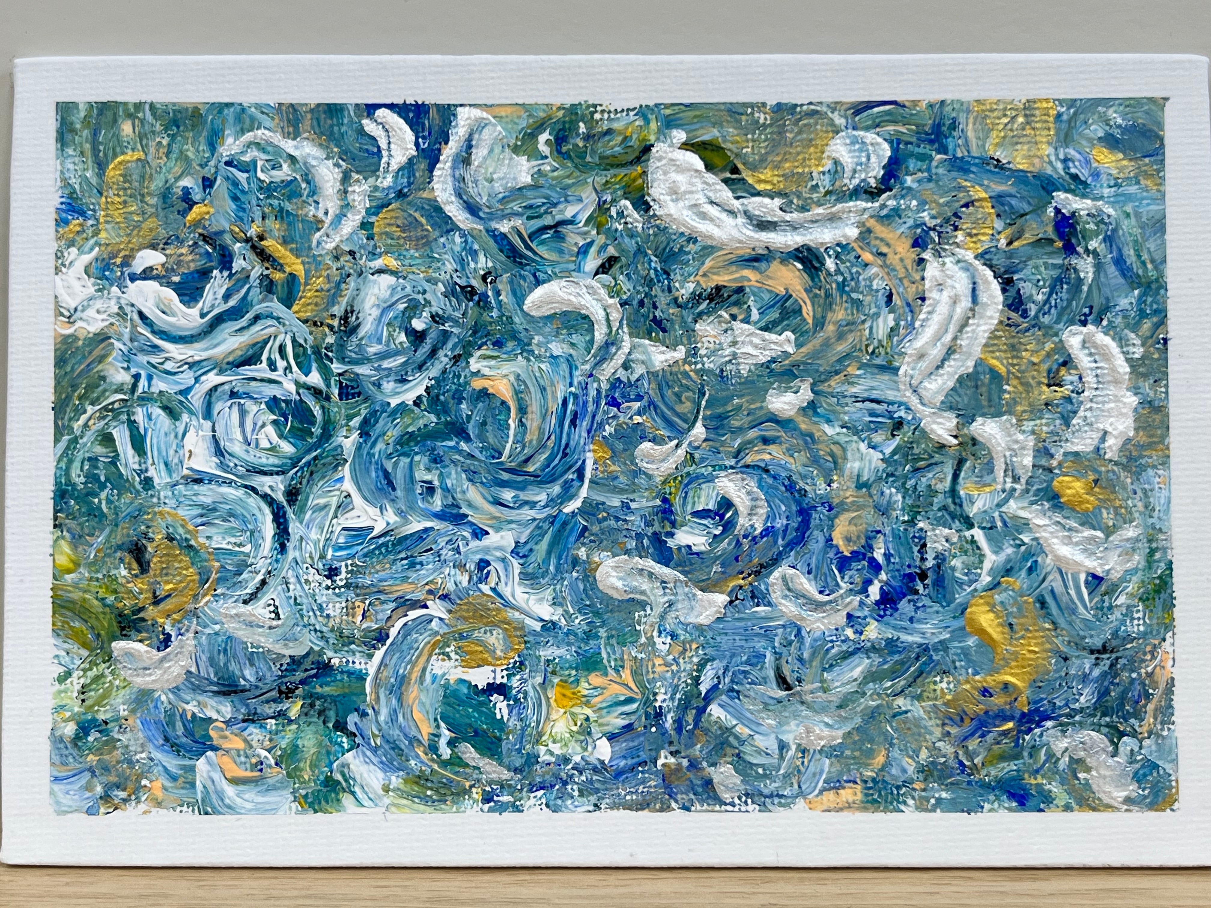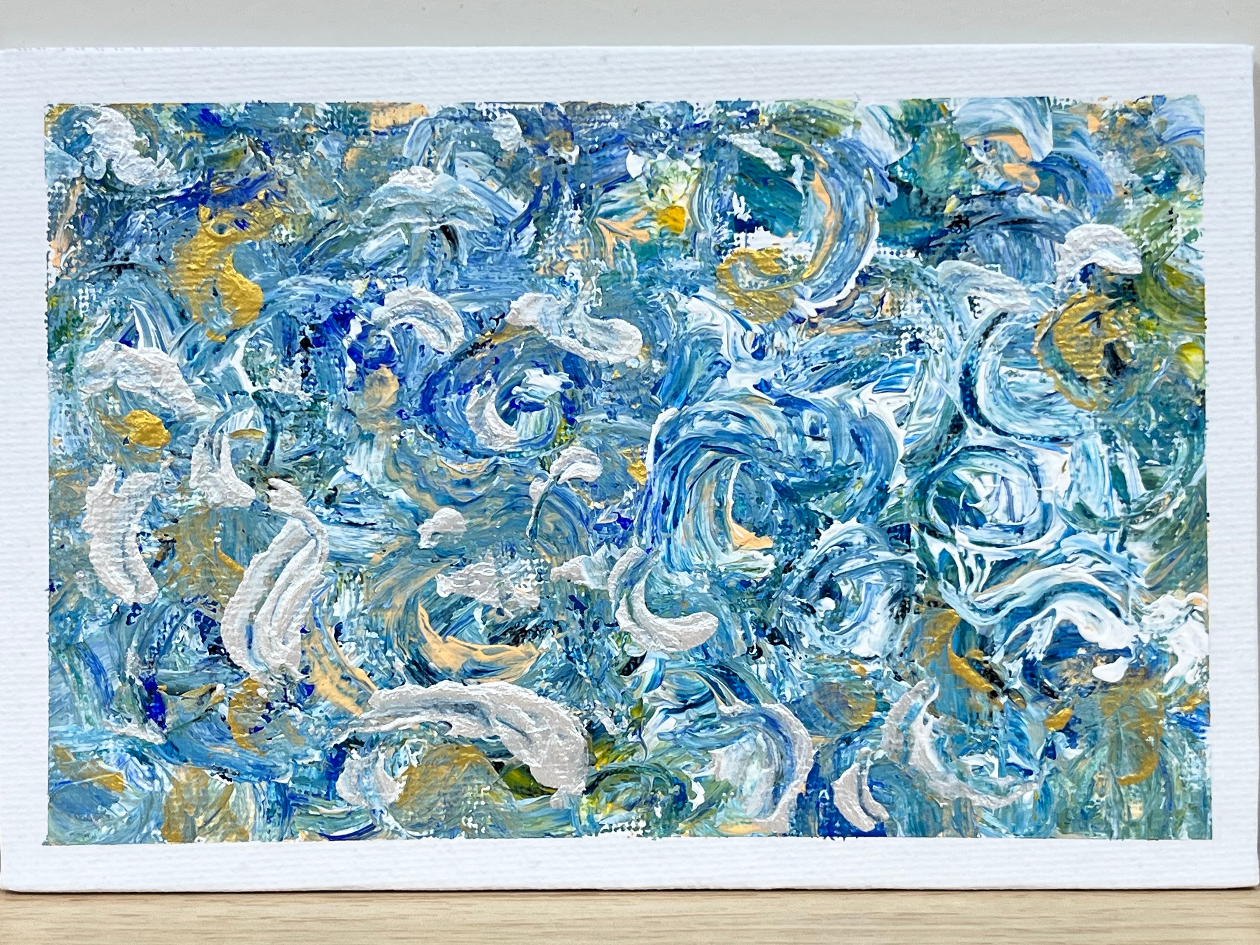 深い青の渦が優しく絡み合い、白と金の光がそっと舞う作品です。心のざわめきを静かに包み込み、穏やかな夢のような安らぎを届けてくれます。日常の疲れを優しく溶かす、静かな癒しの時間をお届けします。