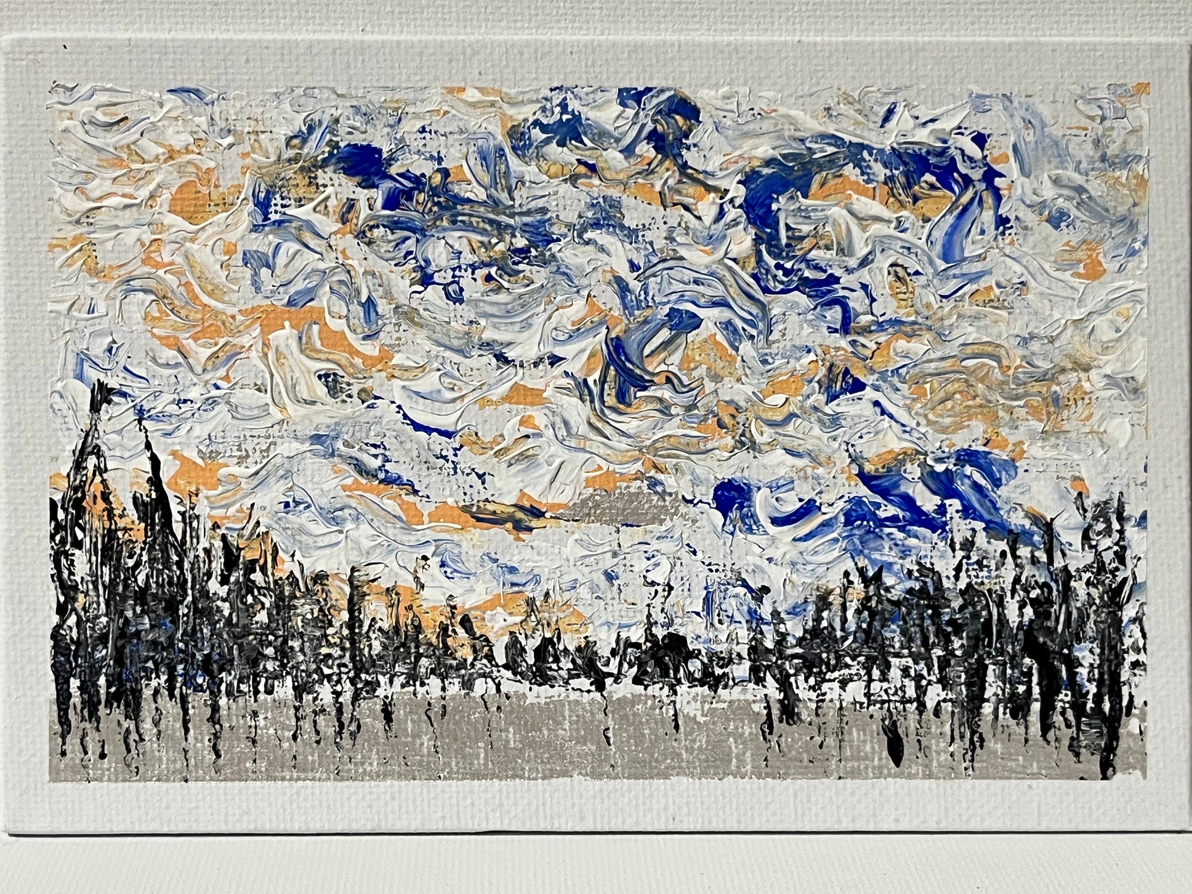 夕暮れの空に広がる柔らかな青と金が、遠くの森の影を優しく照らす作品です。心の奥に潜む寂しさをそっと受け止め、静かな希望の光を灯してくれます。冬の長い夜に寄り添う、温かな存在です。