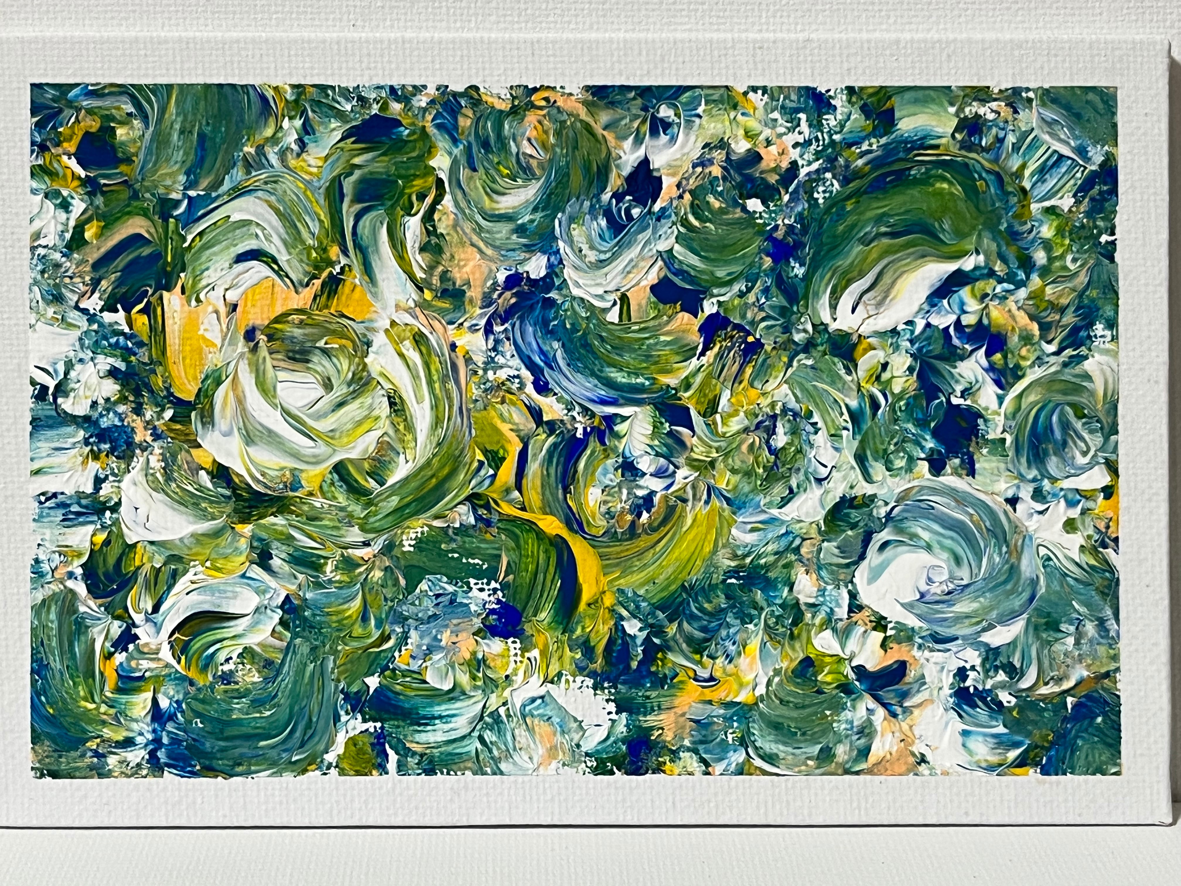 青と緑の波が優雅に重なり、金の輝きが花のように咲き乱れる作品です。心の揺らぎを優しく抱きしめ、内側から湧き上がる穏やかな喜びを静かに伝えてくれます。日常の喧騒から離れた、深い安らぎを感じる一枚です。