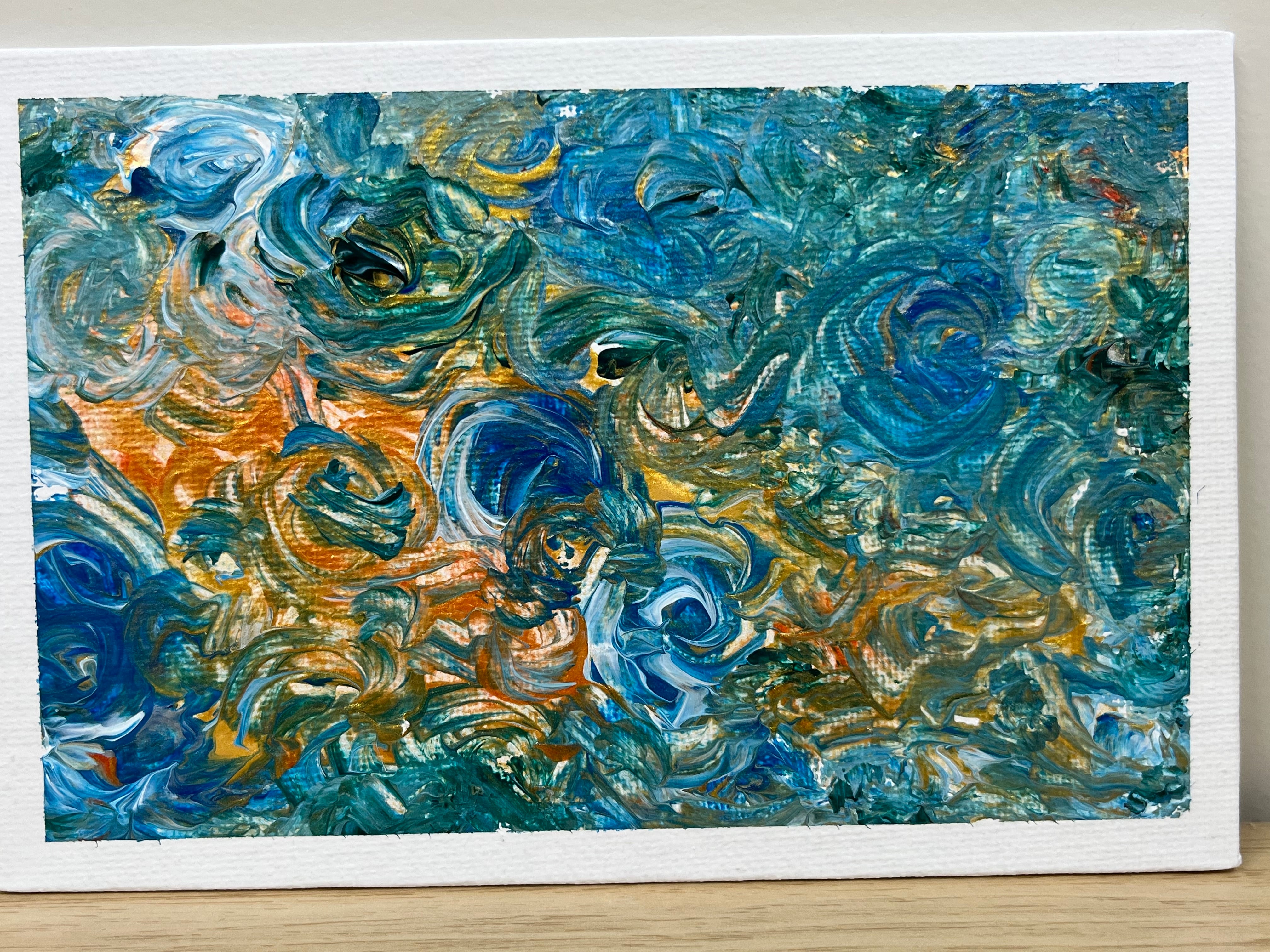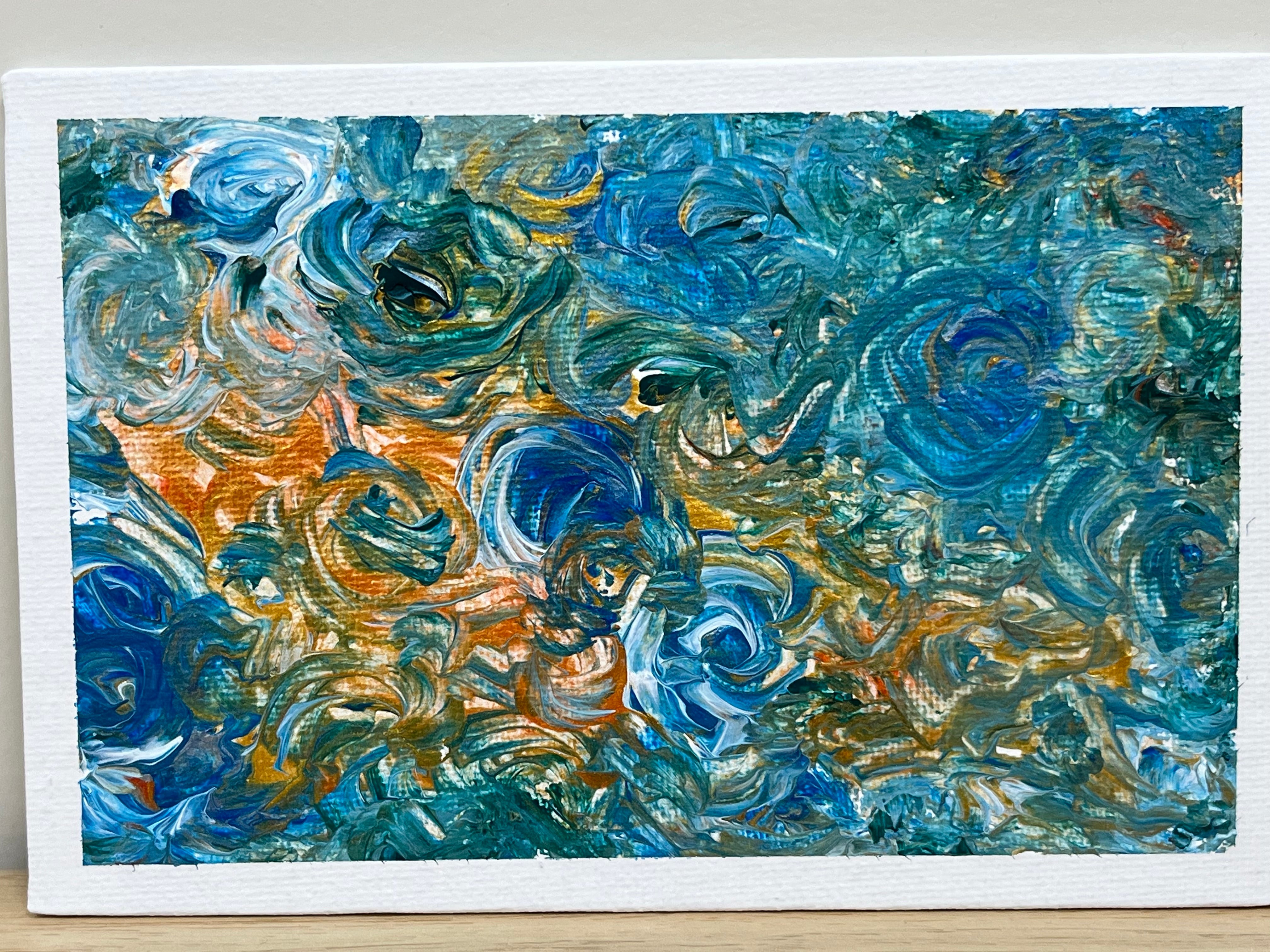 青と緑の渦が橙の光を飲み込みながら、ゆっくりと広がっていく作品です。遠い宇宙の始まりを思わせるような、静かで壮大な誕生の瞬間を表現しています。心の深いところで芽生える未知の感情に、優しく寄り添う幻想的な輝きです。