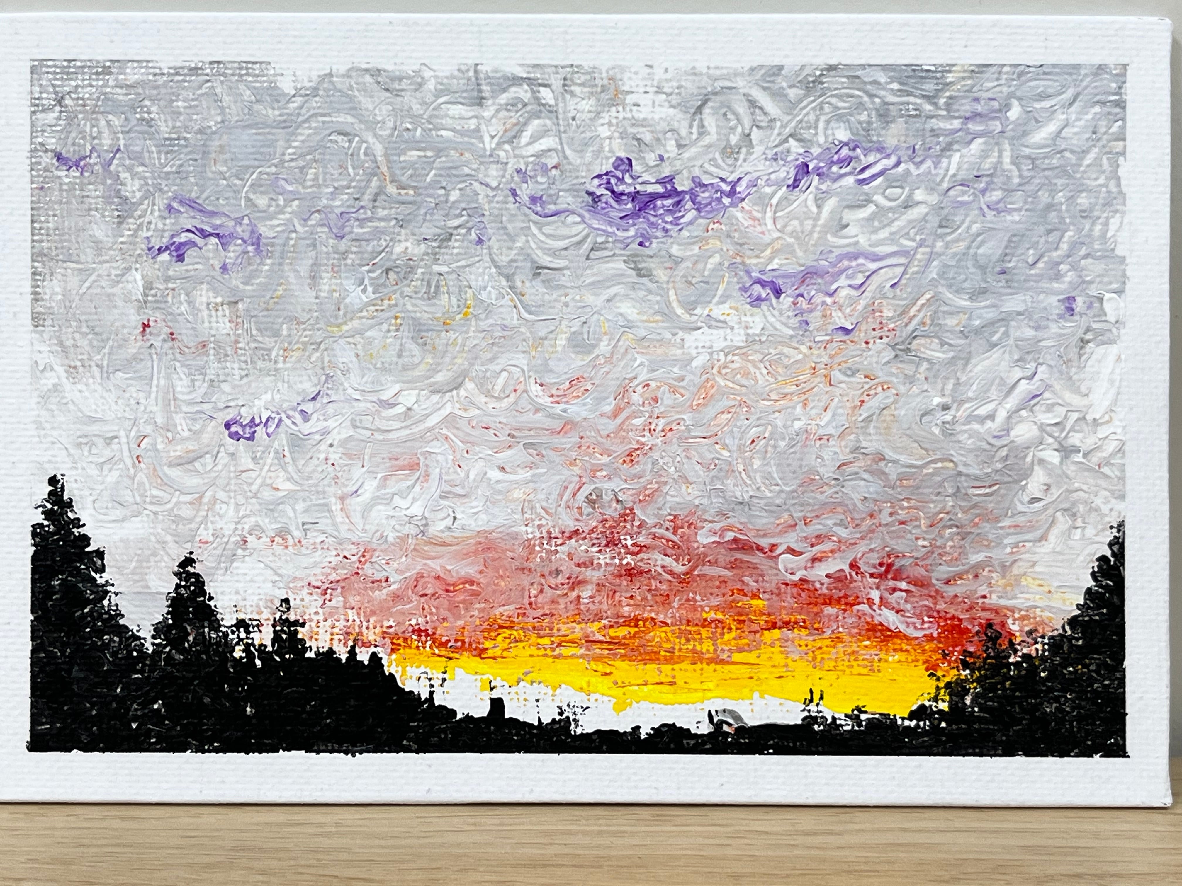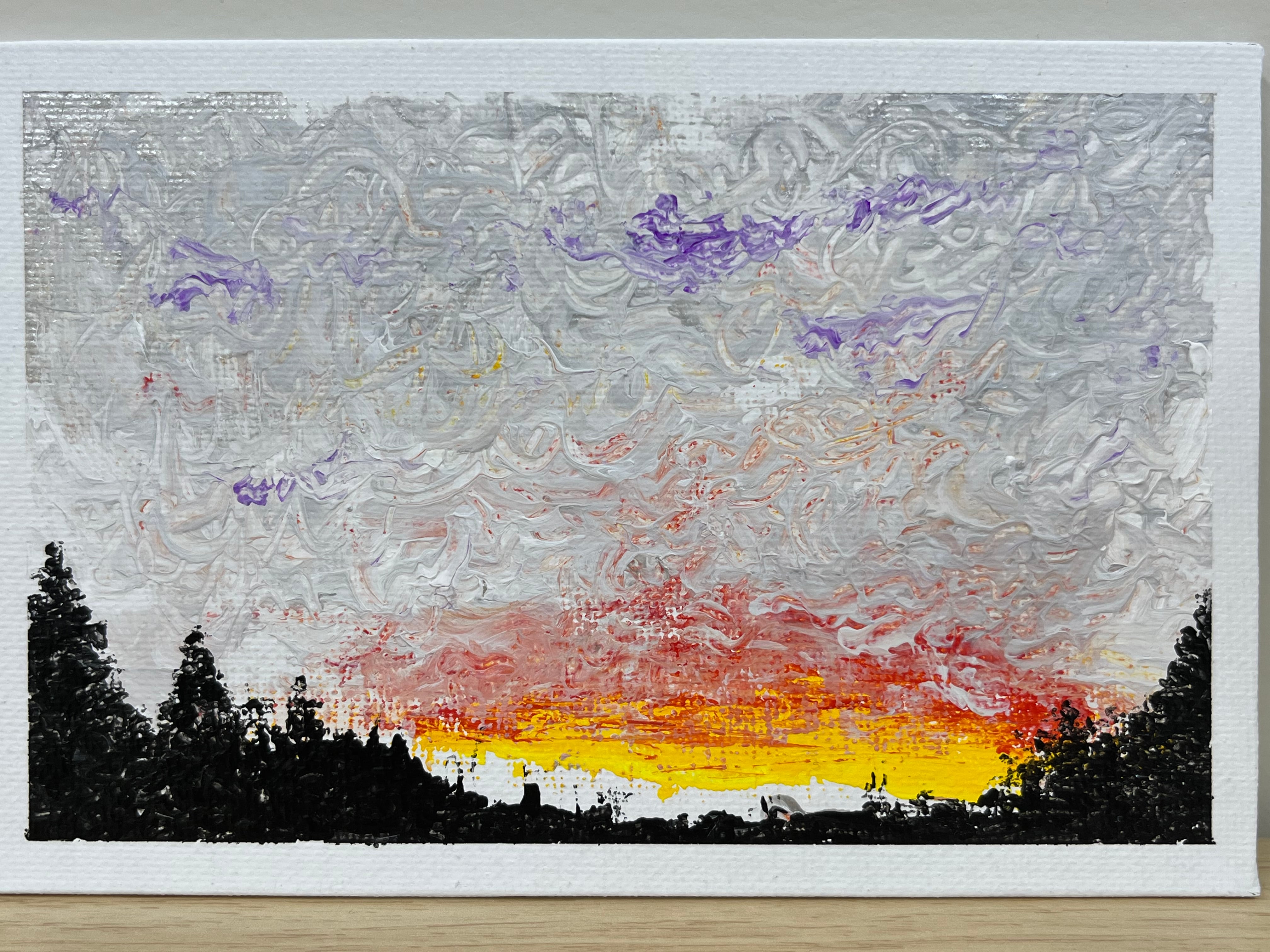 厚く重なる灰色の雲の下で、遠くに燃えるような夕焼けがわずかに覗く作品です。心の奥に沈む静かな不安と、かすかな希望の灯りが交錯するような、幻想的な余韻を残します。日常の端で息づく、儚く美しい瞬間をそっと描き出しています。