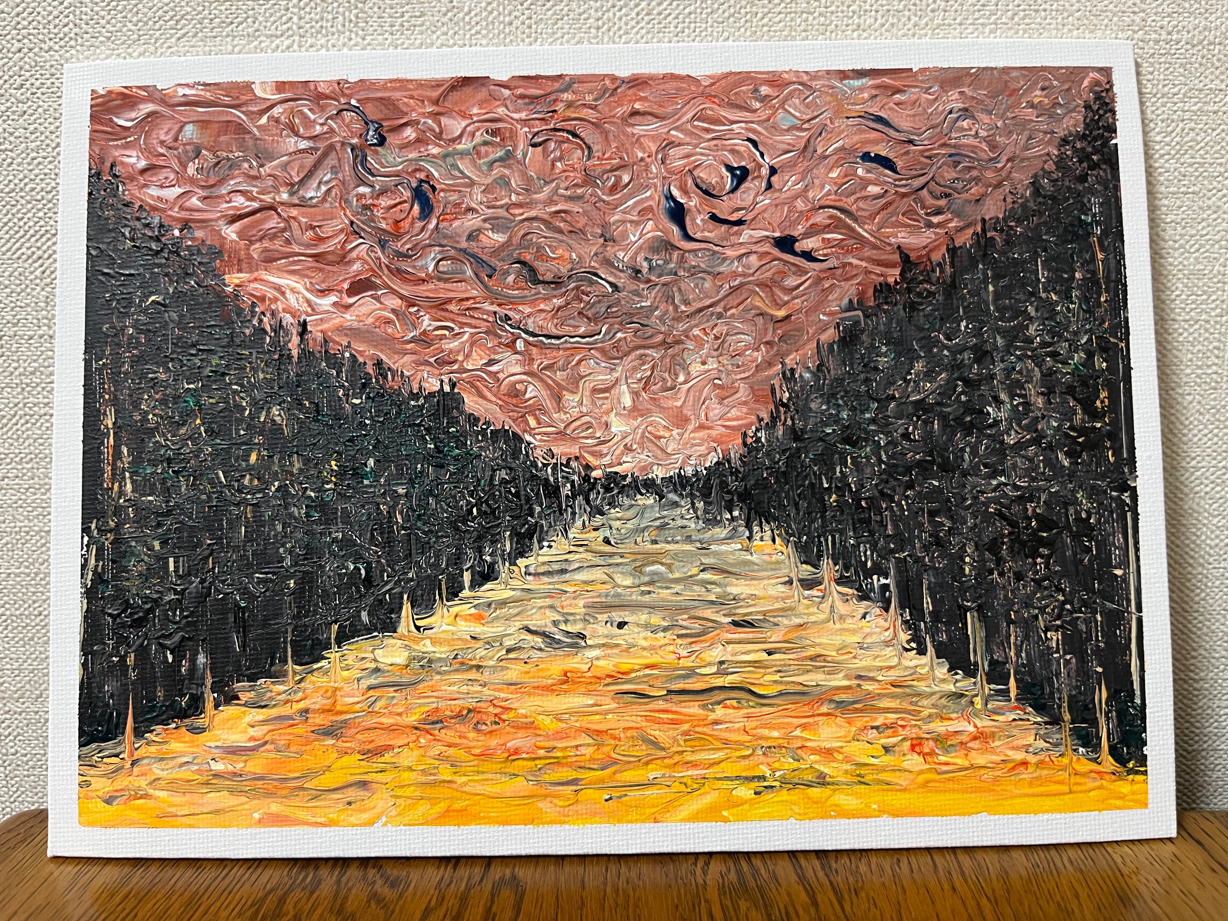 深い森の闇を抜け、桃色の雲が渦を巻く空が広がる幻想的な作品です。