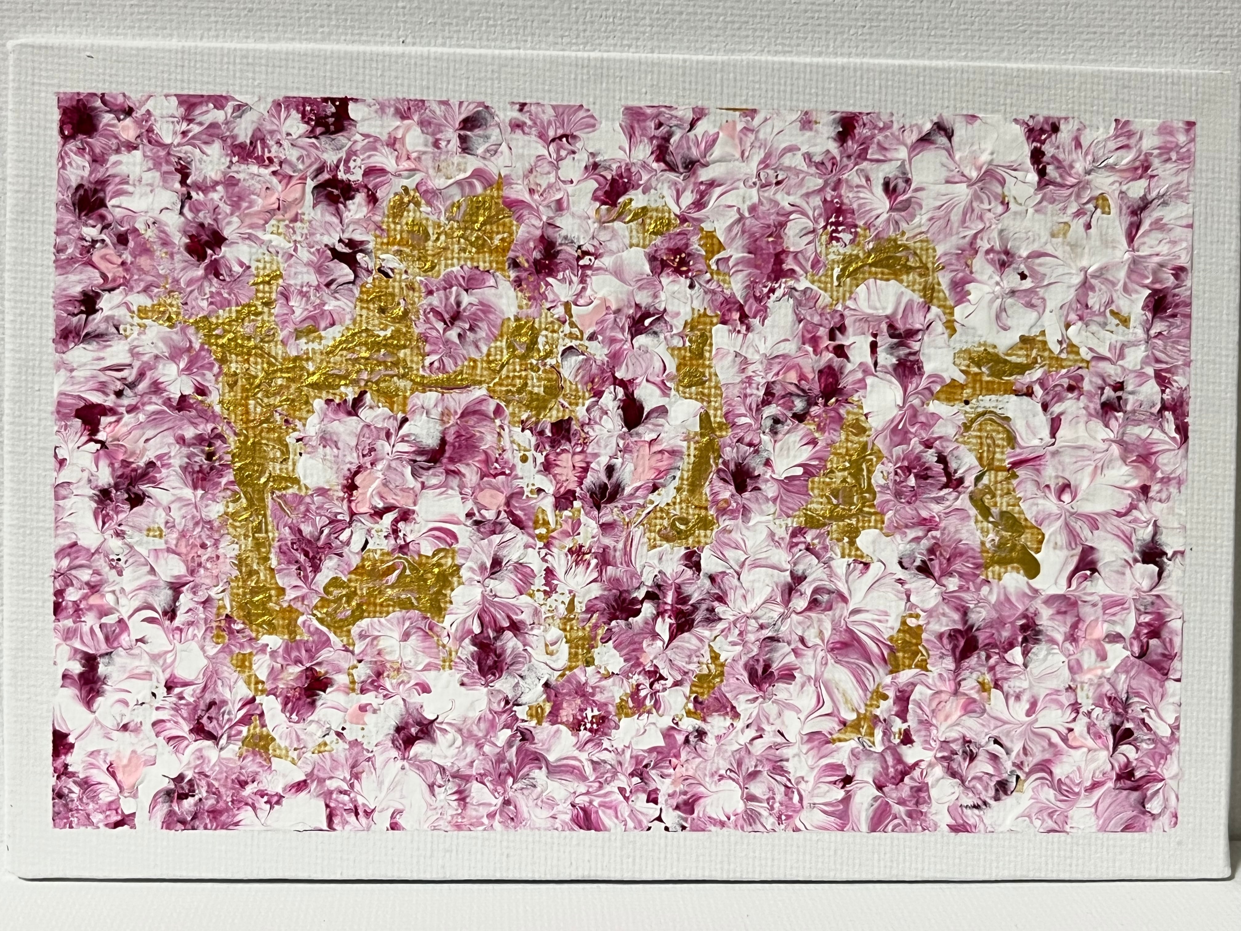 深い紫と白を纏った繊細で美しい花びらが、輝く金の舞台に舞い、静かに空間に響き合う作品です。心の奥底に残る微かな記憶や、言葉にできない想いを、優しく受け止めてくれます。過ぎ去った時間に寄り添いながら、新たな静けさを生み出すような、幻想的な余韻を残します。