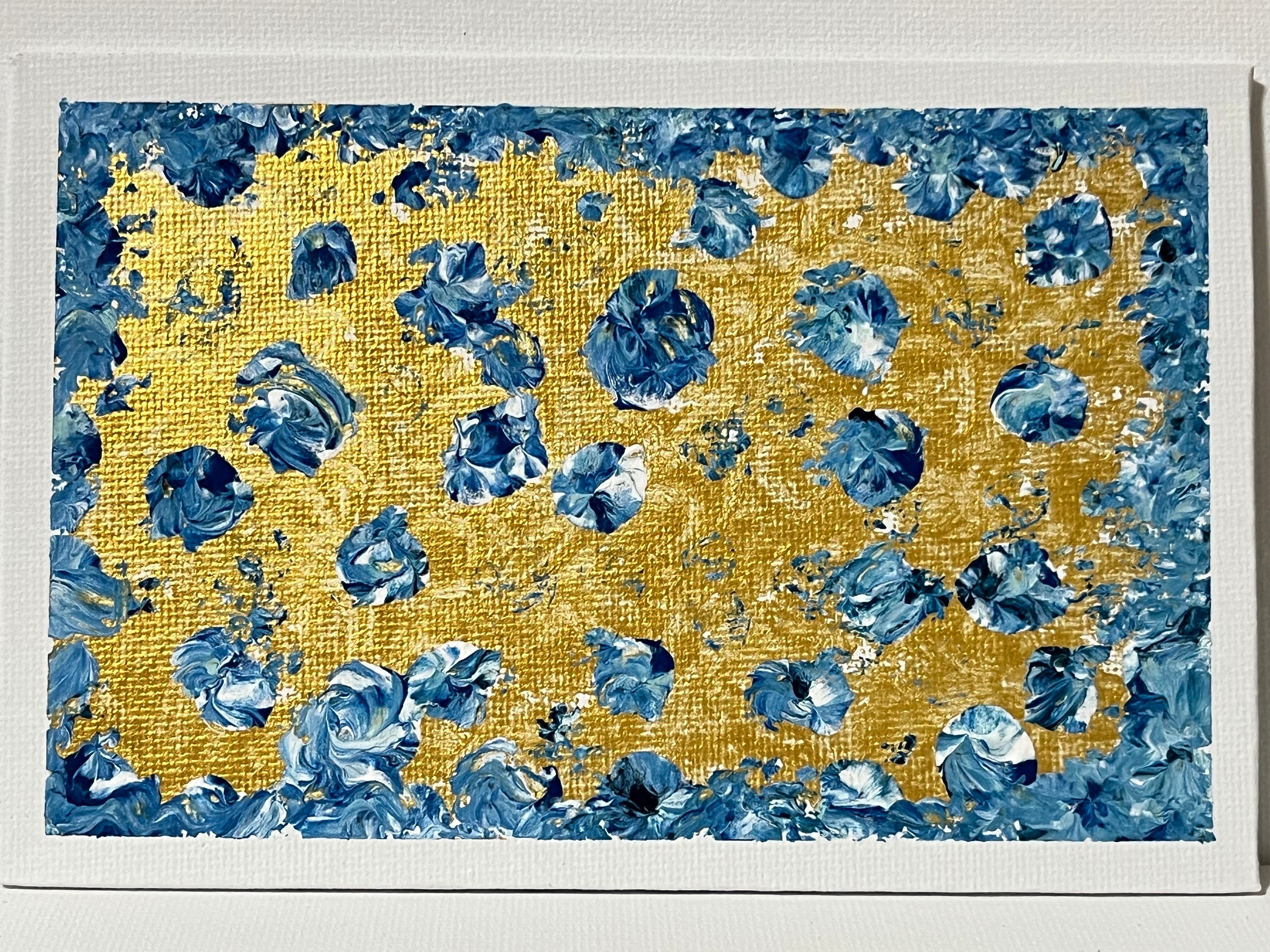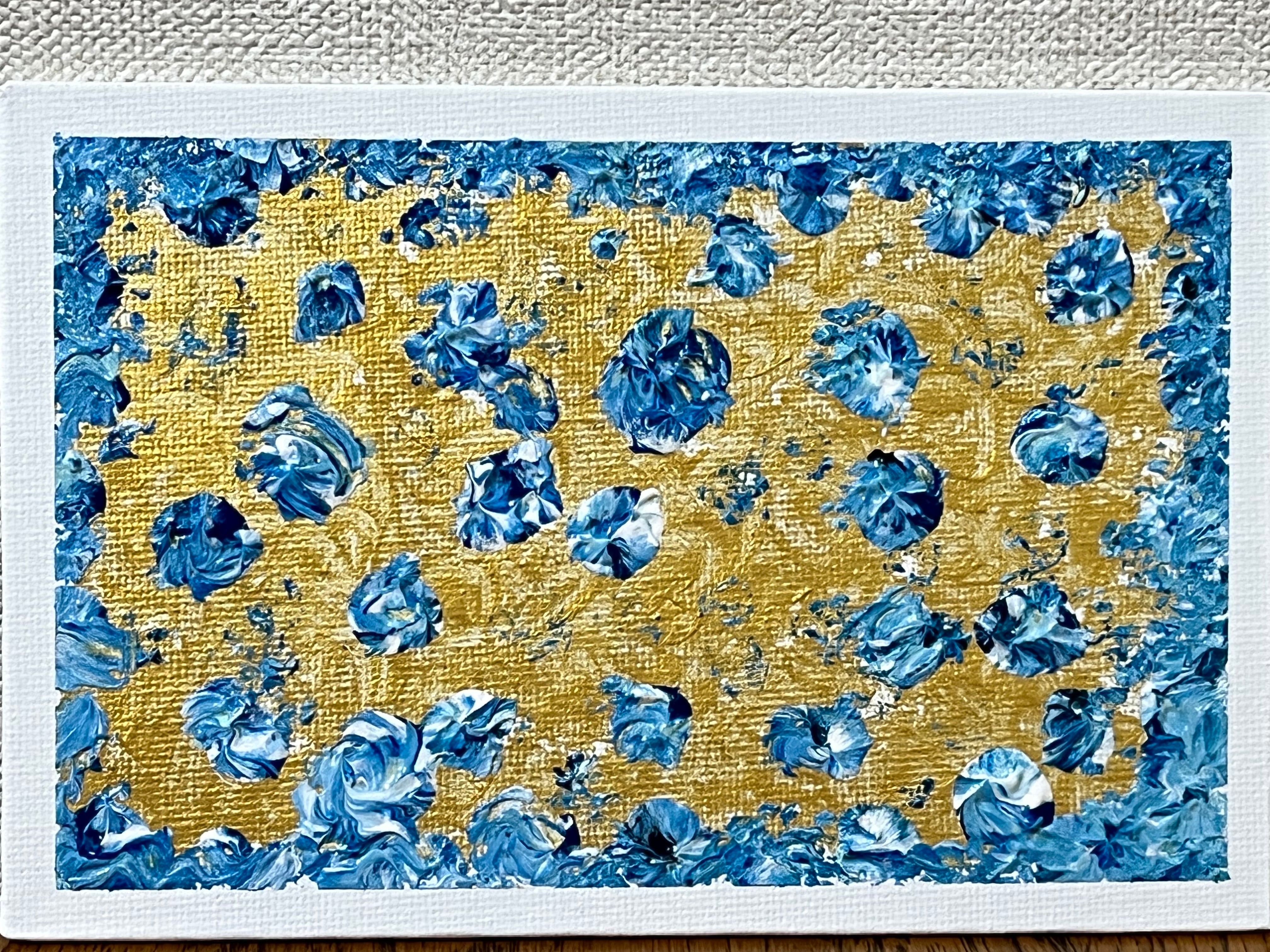 ゴールドの空間に浮かぶ深い青のモザイクが静かに意識に溶け込む作品です。繊細な青の色彩が、まるで宇宙の神秘を感じさせるかのように広がり、心の中に安らぎと希望をもたらします。静かに流れる時間の中で、自身の内側に目を向けるひとときを感じながら、夢の中にいるような感覚をお楽しみください。