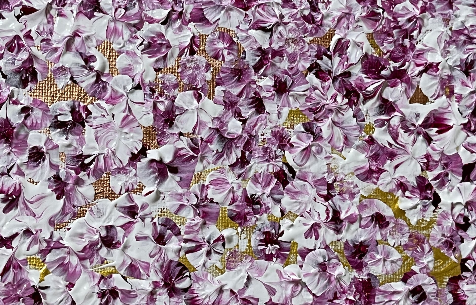 深い紫の幻想が広がる中、静かに揺れる花びらの世界を描いた抽象アクリル画の画像データです。優雅な紫色のグラデーションが心に浸透し、穏やかで優しい空間を創り出します。心の奥に棲む静かな安らぎを求めるような、夢の中の聖域を訪れる気持ちを体験してください。