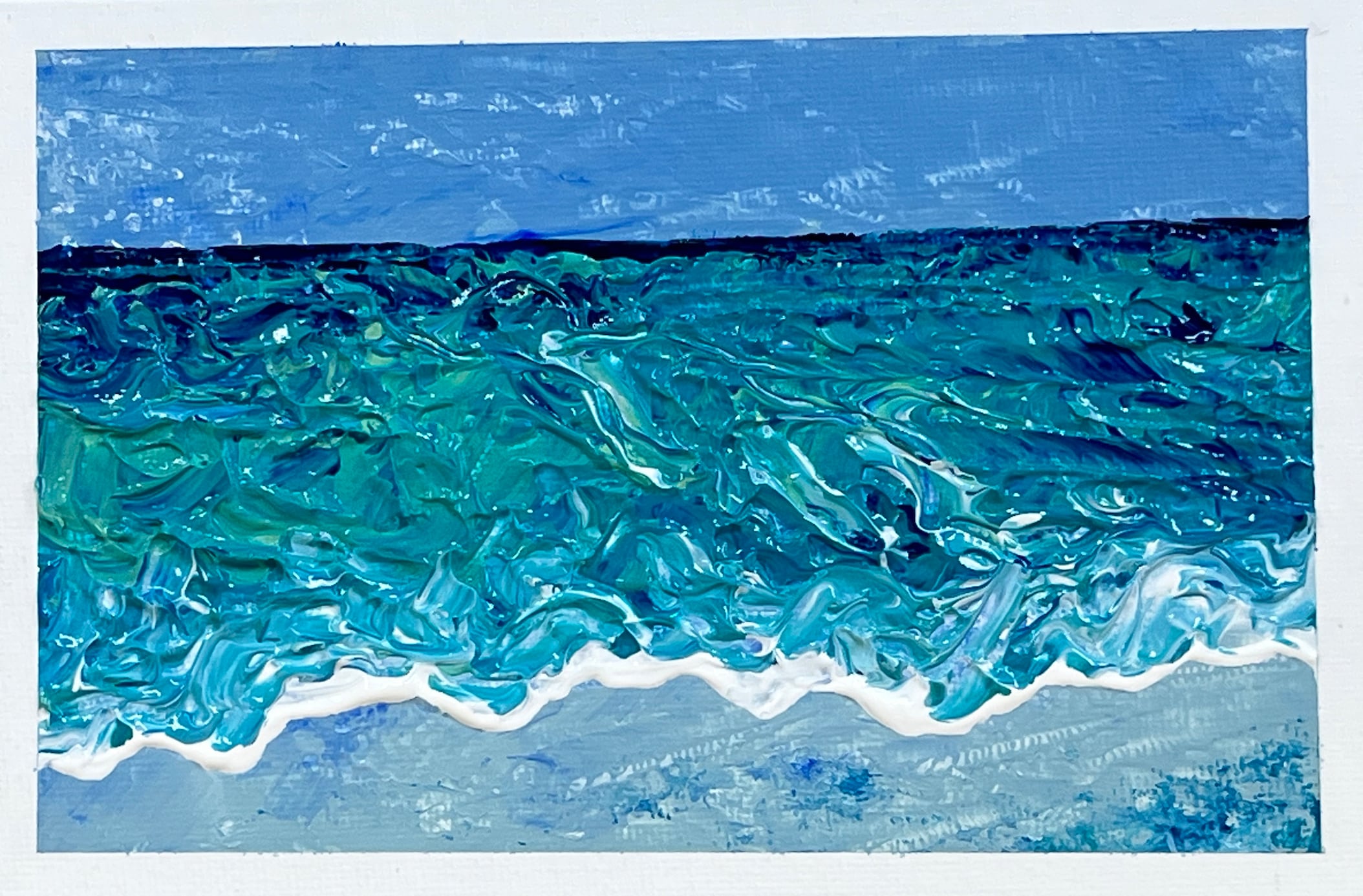 静かに揺れる青の波が心に新たな感動を呼び起こし、まるで海の彼方に広がる大空を映し出すかのように、心の奥深くに安らぎを与えてくれる抽象アクリル画の画像データです。穏やかな時間が流れる中で、自身の内面と向き合うひとときを体験し、心の広がりを感じる瞬間をお届けします。