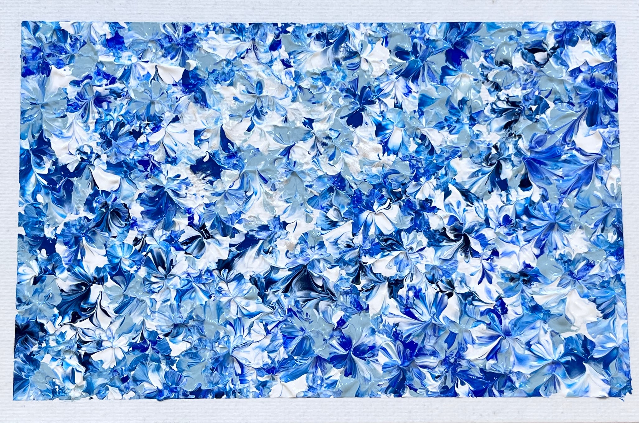 さわやかな青の世界に花模様が美しく広がる優雅なデザインは、まるで花々が舞い散る庭に佇む心地良さを感じさせ、心に安らぎの瞬間を提供する抽象アクリル画の画像データです。