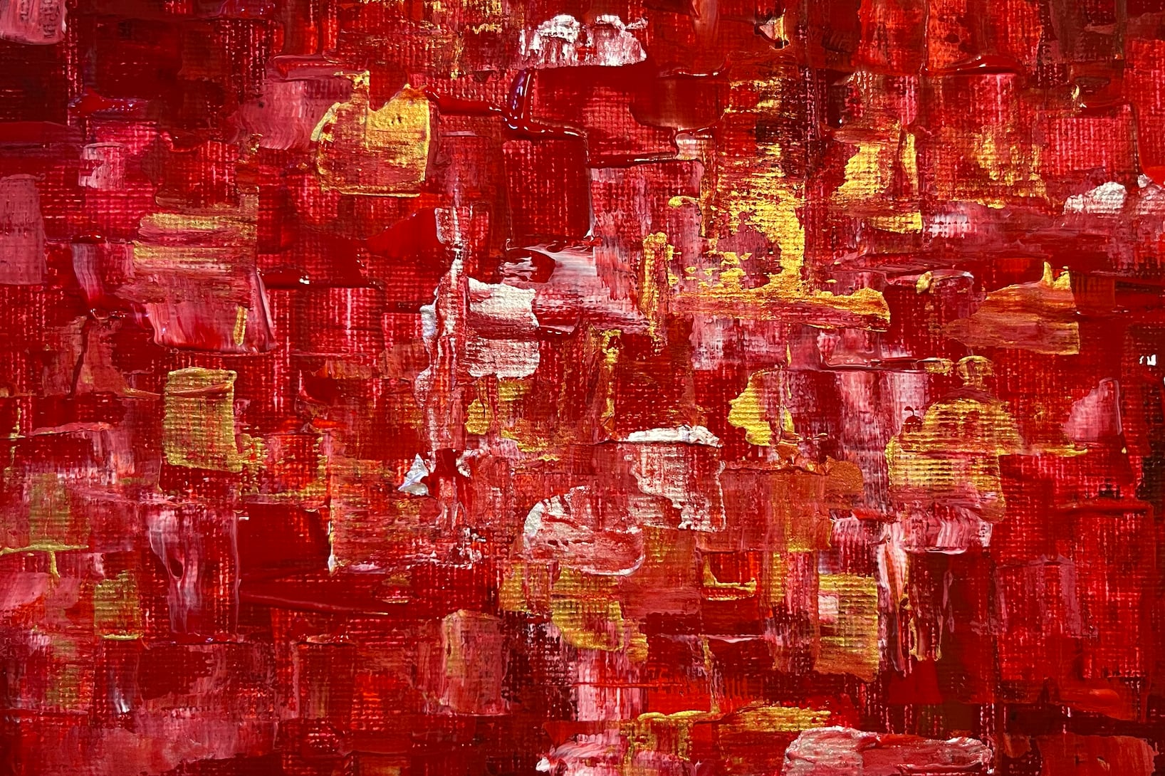 心を燃え立たせる美しく力強い色彩が生命の力を感じさせ、まるで情熱の炎が心の奥深くに広がる抽象アクリル画の画像データです。