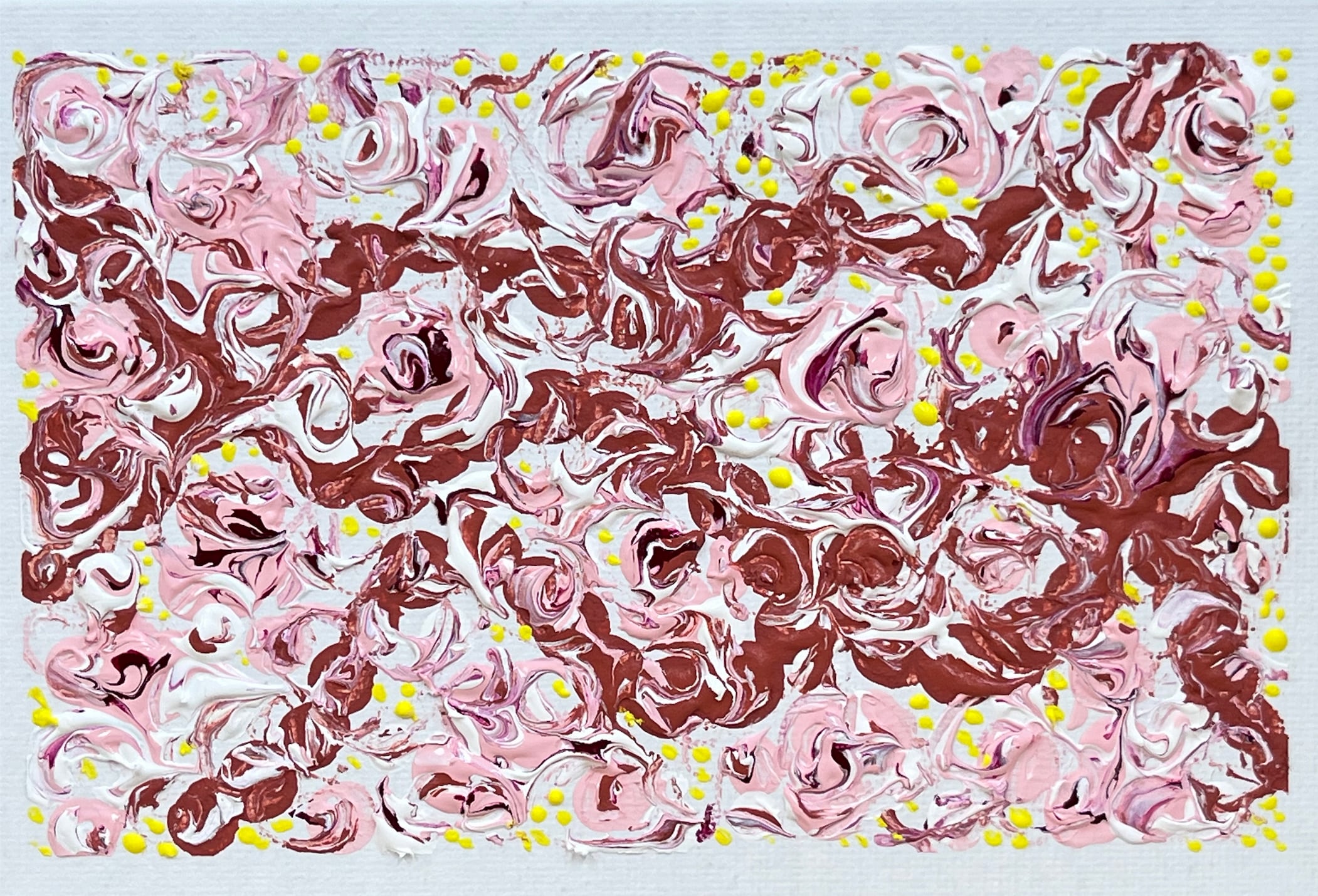 柔らかなピンクと深いボルドーが交わり、心温まるミモザの花々が舞います。この作品は、色彩の重なりによって生まれる温かな息吹を感じさせ、静寂の中に秘めた情熱をそっと解き放ちます。見る者の心に静かに響く美しさが、特別な空間を演出することでしょう。