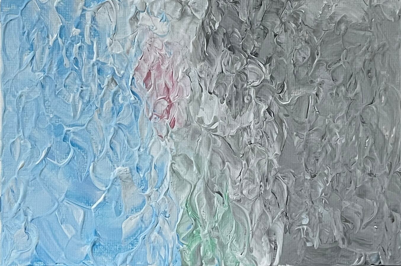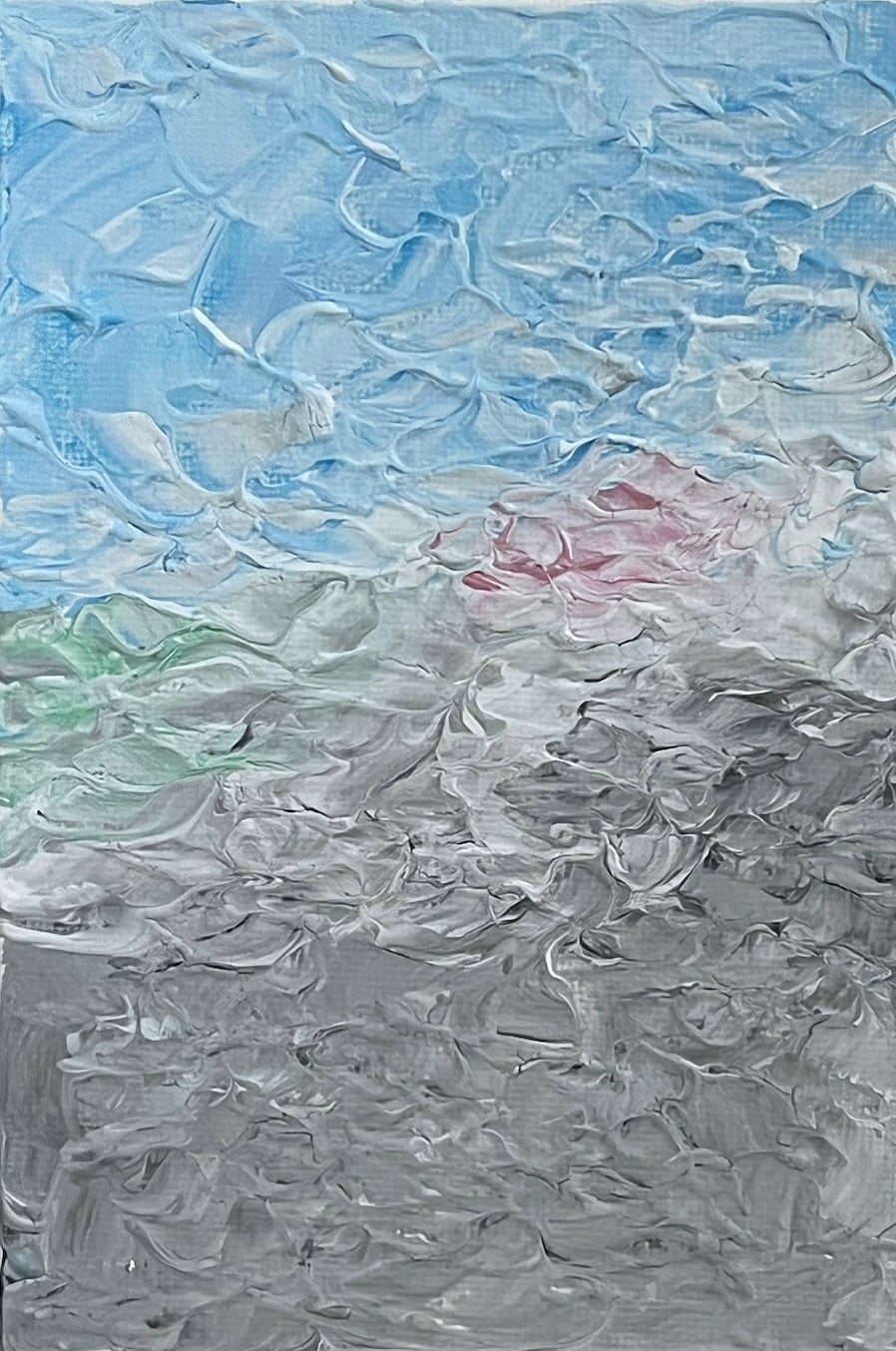 淡いピンクと緑の残像が、澄んだ青の空に浮かぶこの作品は、荒々しさと優しさが共存する独特な質感で、心に深い印象を与えます。忘れられた記憶の欠片が静かに語りかけるような美しさは、観る人々に特別な感動をもたらし、心の奥深くに響く瞬間を提供します。まるで青空の下で過去と現在が交差するような、不思議な体験を味わってください。